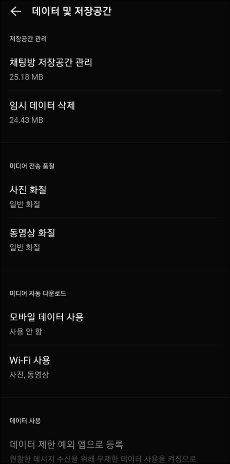- 카카오톡 실행 → 더보기(≡) → 설정 → 데이터 및 저장공간